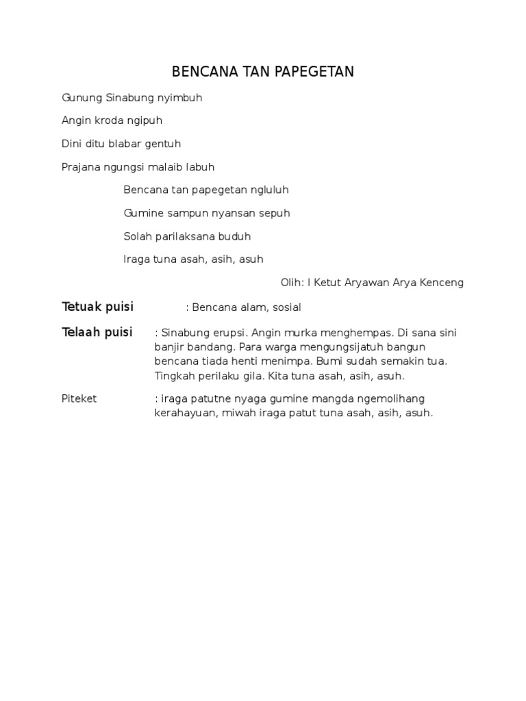 Tentunya puisi yang sederhana. Maksud bait kedua puisi tersebut adalah. Semoga saudara dan keluarga yang di bawah lereng Gunung Sinabung baik-baik saja dan Tetap waspada.