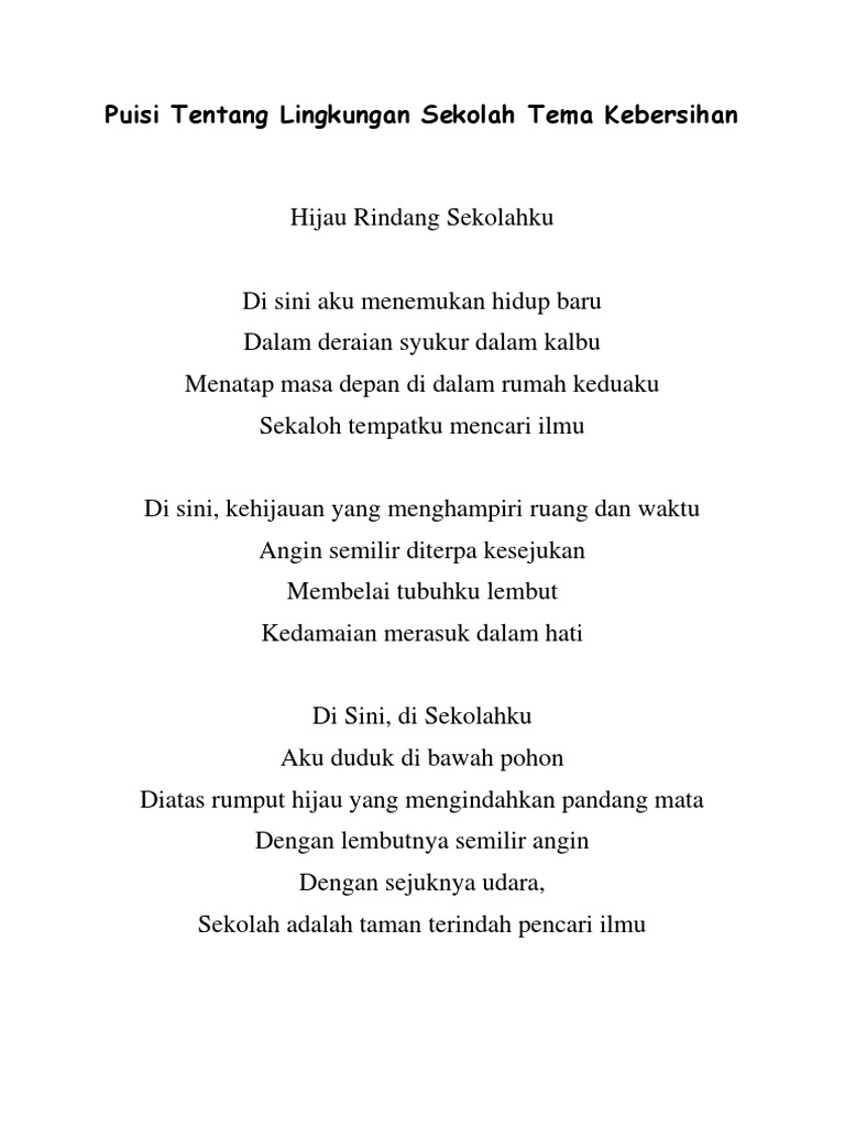 Puisi tentang lingkungan yang kita temukan biasanya terdiri dari 23 sampai 4 bait. Puisi Kebersihan Lingkungan Sekolah. Sekolah adalah lembaga pendidikan formal yang sistematis melaksanakan program bimbingan pengajaran dan latihan dalam rangka membantu siswa agar mampu megembangkan potensinya baik yang menyangkut aspek moral spiritual intelektual emosional maupun sosial.
