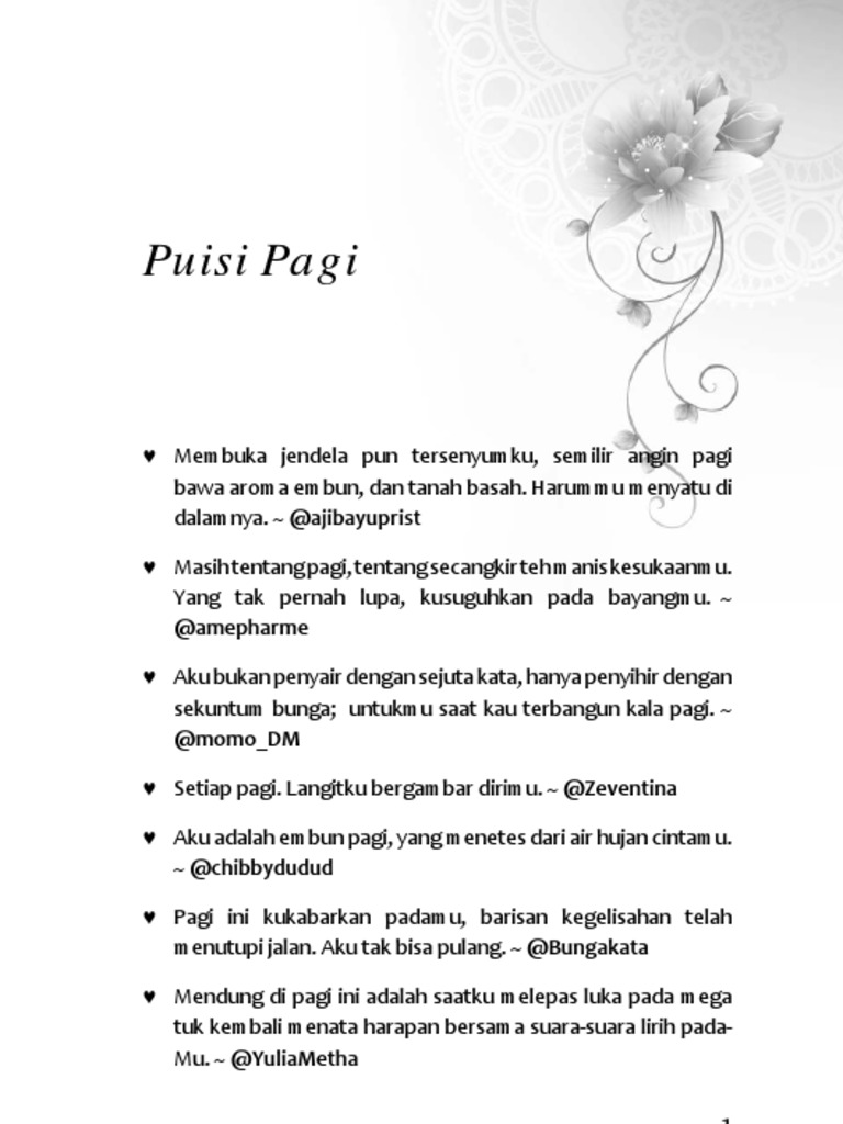 Menangis bukan solusi karena semua hal tersebut pasti terjadi cepat. Aug 11 2018 Sebelas koleksi puisi pagi hari romantis dan puisi di pagi hari tentang cinta yang bisa menemani pagi para pembaca atau mungkin bisa di jadikan sebagai contoh puisi selamat pagi untuk kekasih dan puisi romantis di pagi hari. Dec 10 2020 Puisi Pagi Hari Apa yang terlintas dalam benakmu saat bangun tidur di pagi hari.
