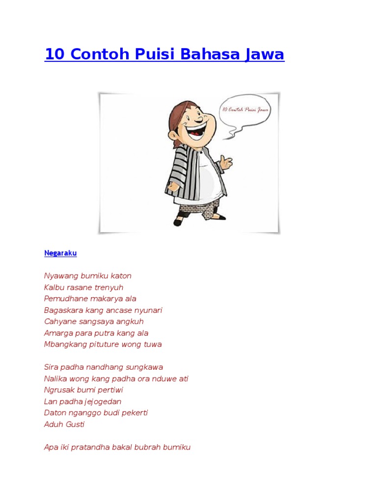 Nah bagi kalian yang sedang mencari contoh puisi bahasa jawa geguritan saya sudah menyediakan 33 contoh geguritan dari berbagai macam tema seperti tema pahlawan tema perjuangan tema keindahan alam dan lainnya. Puisi dapat dibilang merupakan sebuah ekspresi dari sang penulis seperti suka duka.