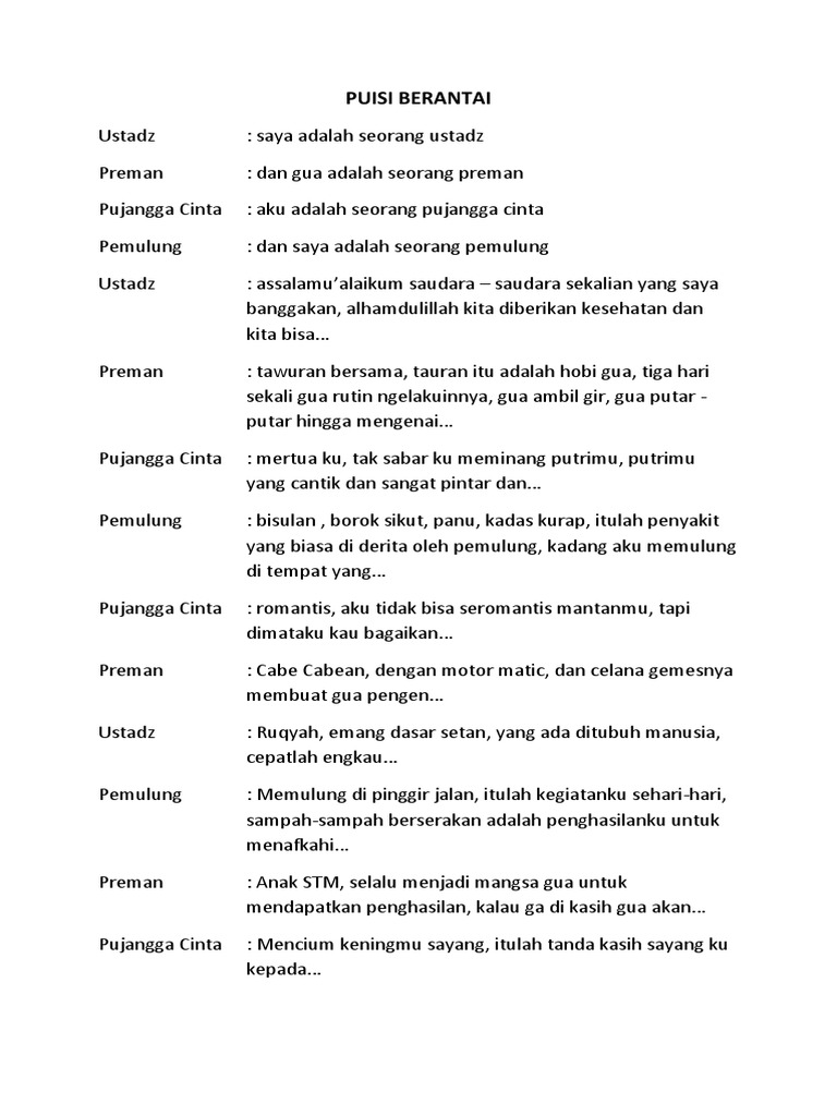 Pemulung Kecil Tengah malam pemulung kecil itu datang memungut barang-barang yang berserakan di lantai rumah. Kumpulan Puisi Islami Anak TK Kami sudah merangkum beberapa Puisi Islami untuk anda. Apr 15 2017 Mau share puisi berantai islami kali ini 5 orang dan dibikin pas sedang musyawarah tahunan organisasi pemuda yang kuikuti.