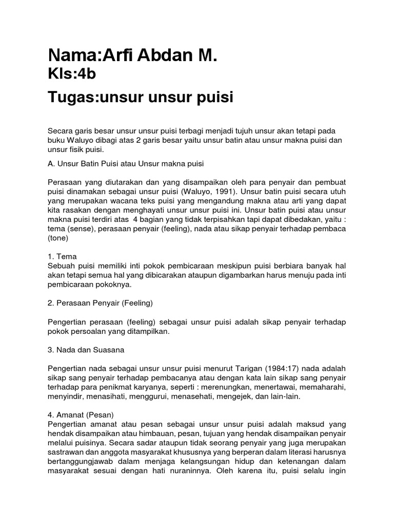 1 Tuliskan Unsur Unsur Dalam Puisi Tersebut Beserta Penjelasannya 2 Apa Isi Dari Puisi Brainly Co Id